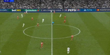 于是在第18分钟,在经历了对手的连续施压过后,在赫伊森和居莱尔的帮助下,皇马打出了他们想要的进攻,这是他们本场第一次反击,也是相对威胁较大的反击之一: